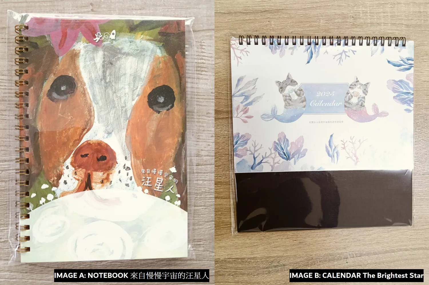 The image A is a 2025 notebook named as ''來自慢慢宇宙的汪星人'' from fhl center We bought total 300 to support Physically and Mentally Disabled people to learn and become more independent.